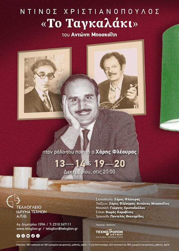 Ο Χάρης Φλέουρας «γίνεται» ο Χριστιανόπουλος επί σκηνής στη θεατρική παράσταση «Ντίνος Χριστιανόπουλος – Το Ταγκαλάκι» του Αντώνη Μποσκοΐτη, στο Τελλόγλειο Ίδρυμα Τεχνών ΑΠΘ, μεταφέροντας με συγκλονιστικό ρεαλισμό τη φωνή και την παρουσία του.